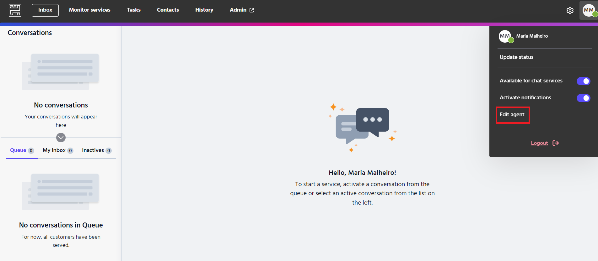 To change your profile picture, simply access Zenvia Chat - Agent Profile and click on Edit Agent in the upper right corner.
