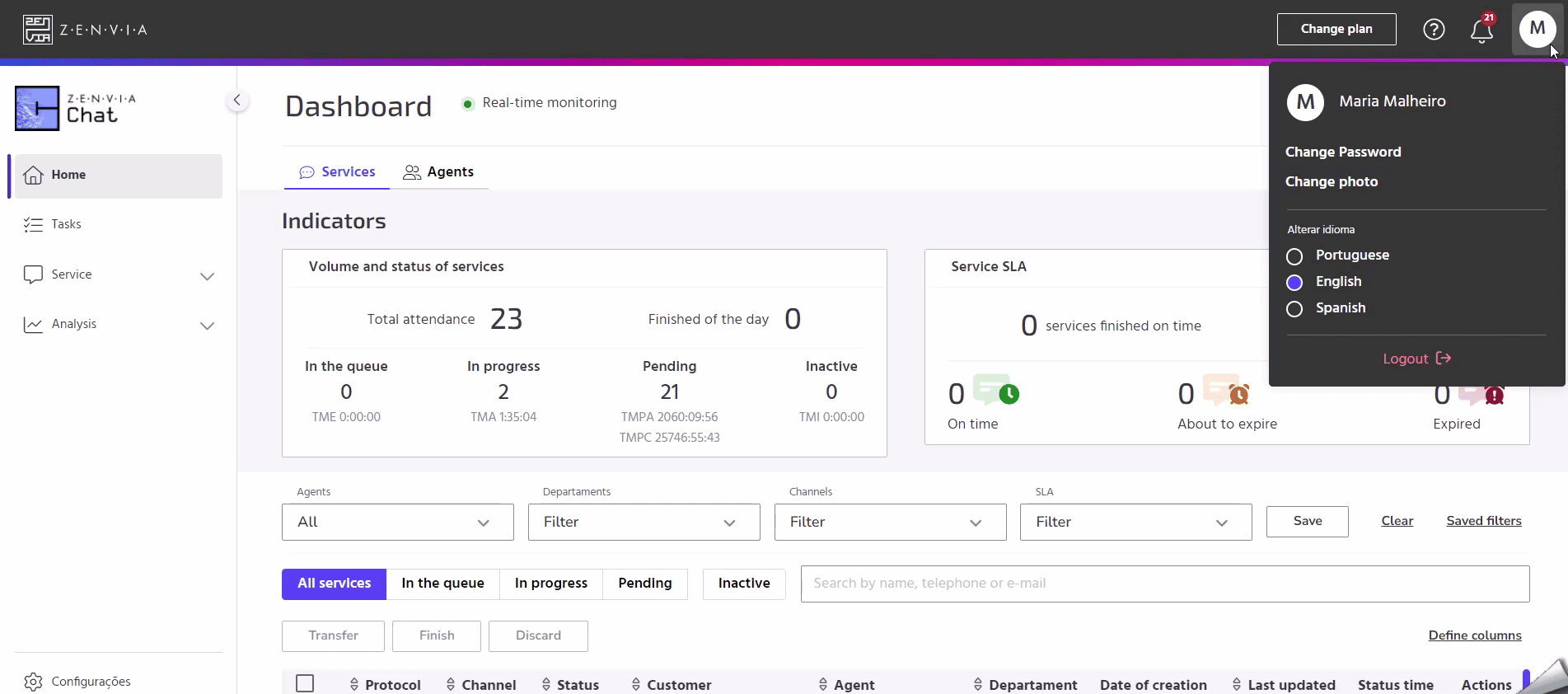 In Zenvia Chat you can change your password and profile photo. To do this, log in to Zenvia Chat - Administrator Profile, then access the menu in the top right-hand corner. As shown in the image.