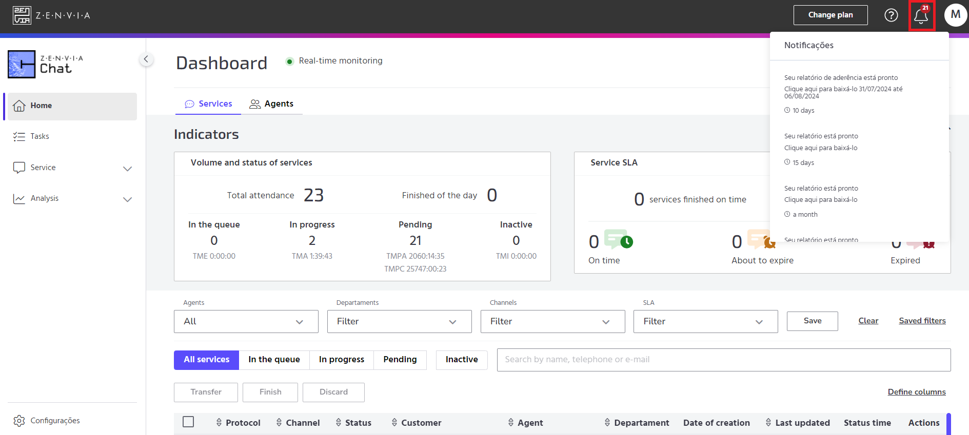 The Zenvia Chat administration environment has a notification area where you can find information on the availability of reports generated, as well as improvements and corrections to the platform.