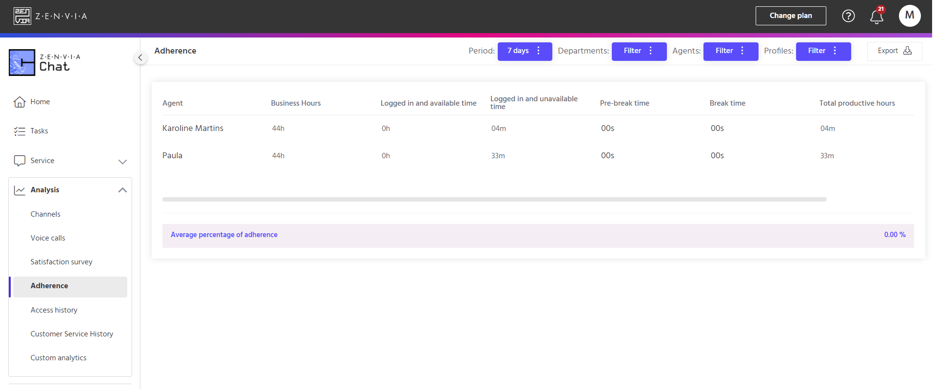 To access this feature, go to Zenvia Chat - Admin Profile > Analysis > Adherence.