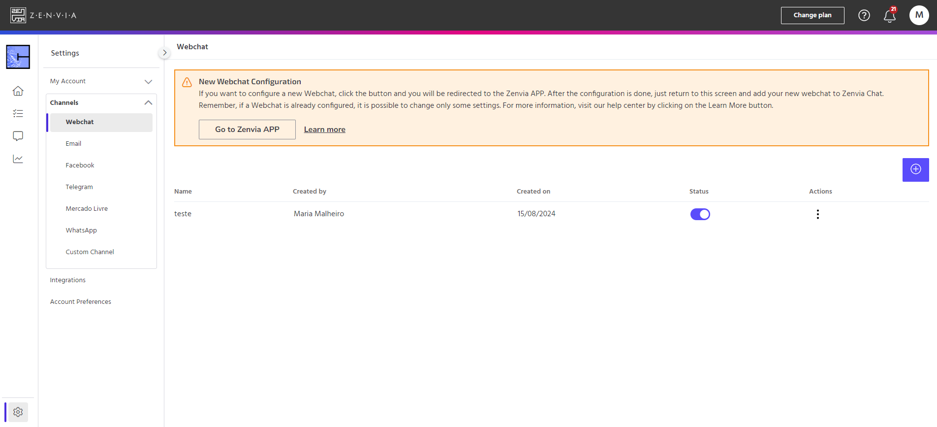 To access this channel, go to Zenvia Chat - Administrator Profile > Settings > Channels > Webchat.