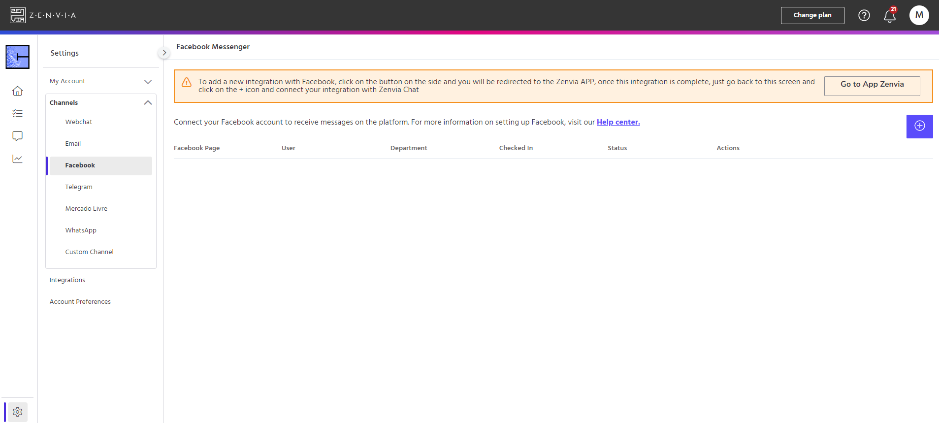 With the Facebook channel you can send and receive messages from your Facebook page via Zenvia Chat. Facebook is a social media platform that allows users to create personal profiles where they can share status updates, photos, videos and other content with their friends, family and colleagues. In addition, the platform offers features such as groups, events and pages, which allow users to connect with specific communities and shared interests.