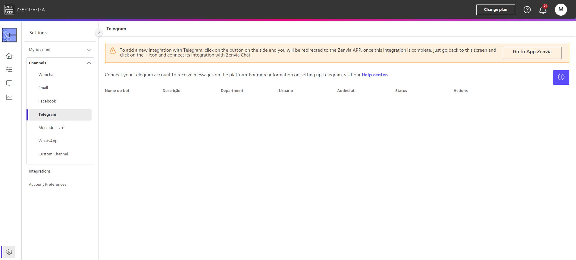 - Integrate your Telegram account with Zenvia Chat. To do this, click on the + button in the top right-hand corner.