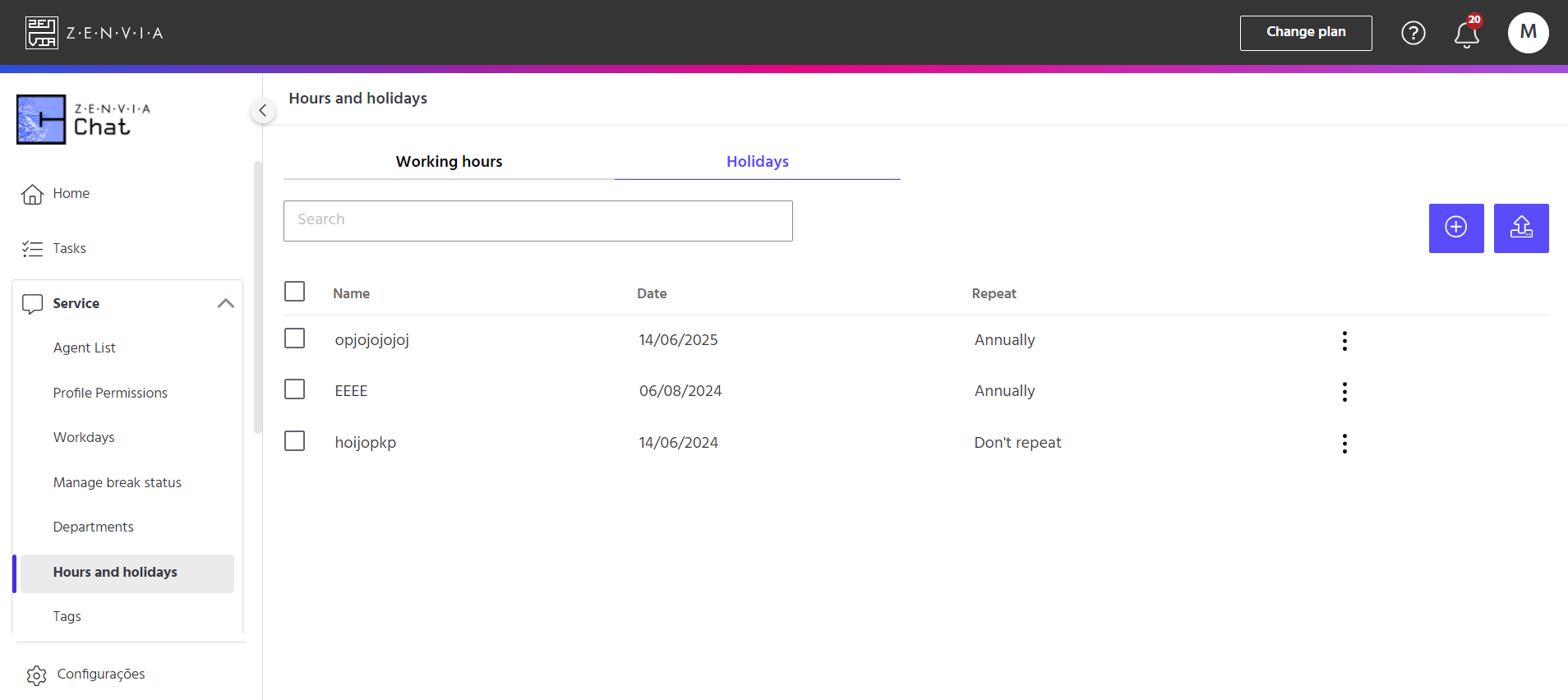 To access the Service hours and holidays feature, go to Zenvia Chat - Administrator Profile > Service > Hours and holidays.