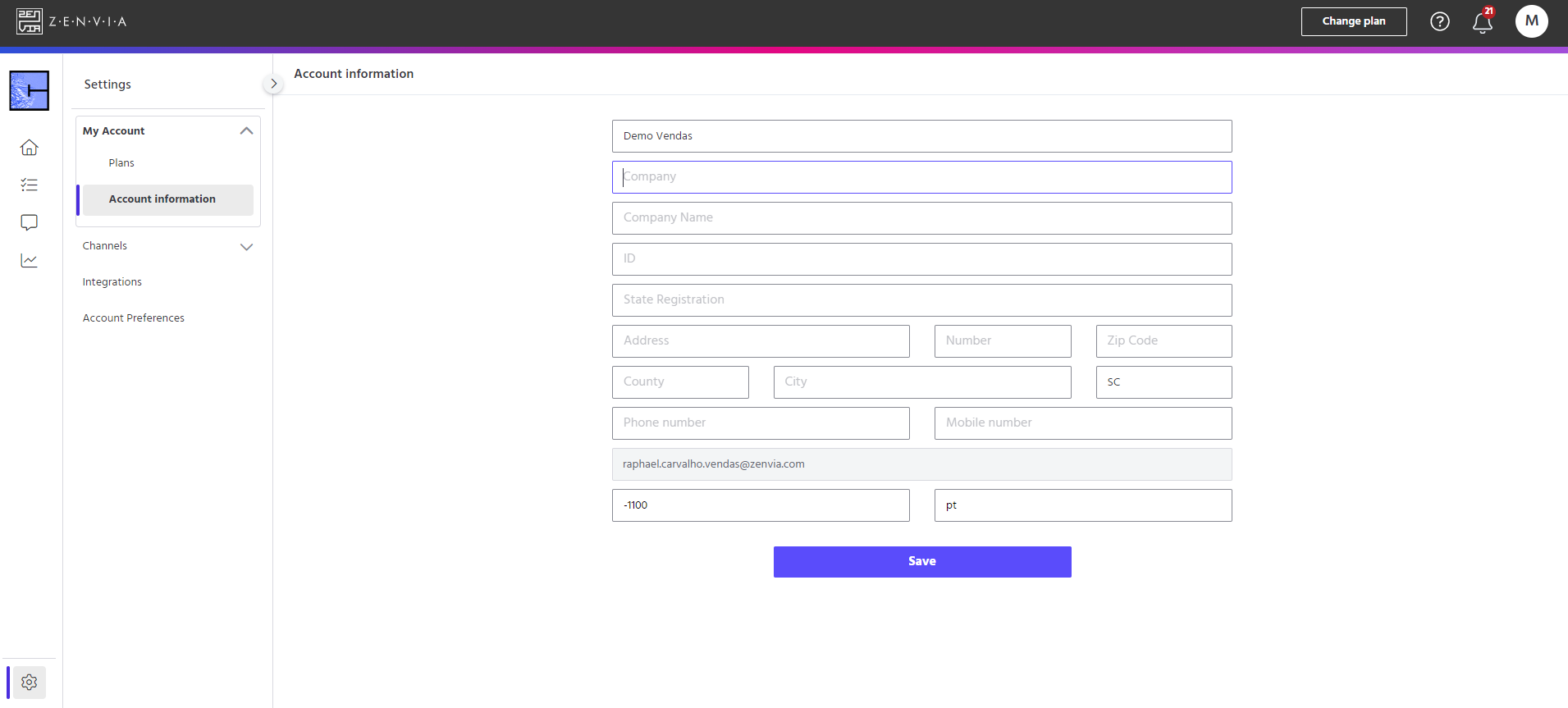 To access your account details, go to Zenvia Chat - Administrator profile > Settings > My Account > Account information