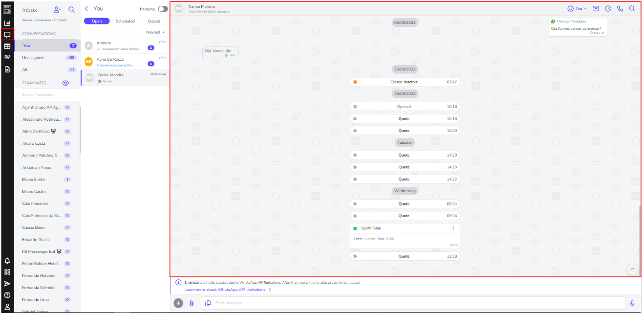 This is the area where the list of chats is located. Every time a contact interacts with your company, whether by sending or receiving a message through any communication channel, it will appear here: