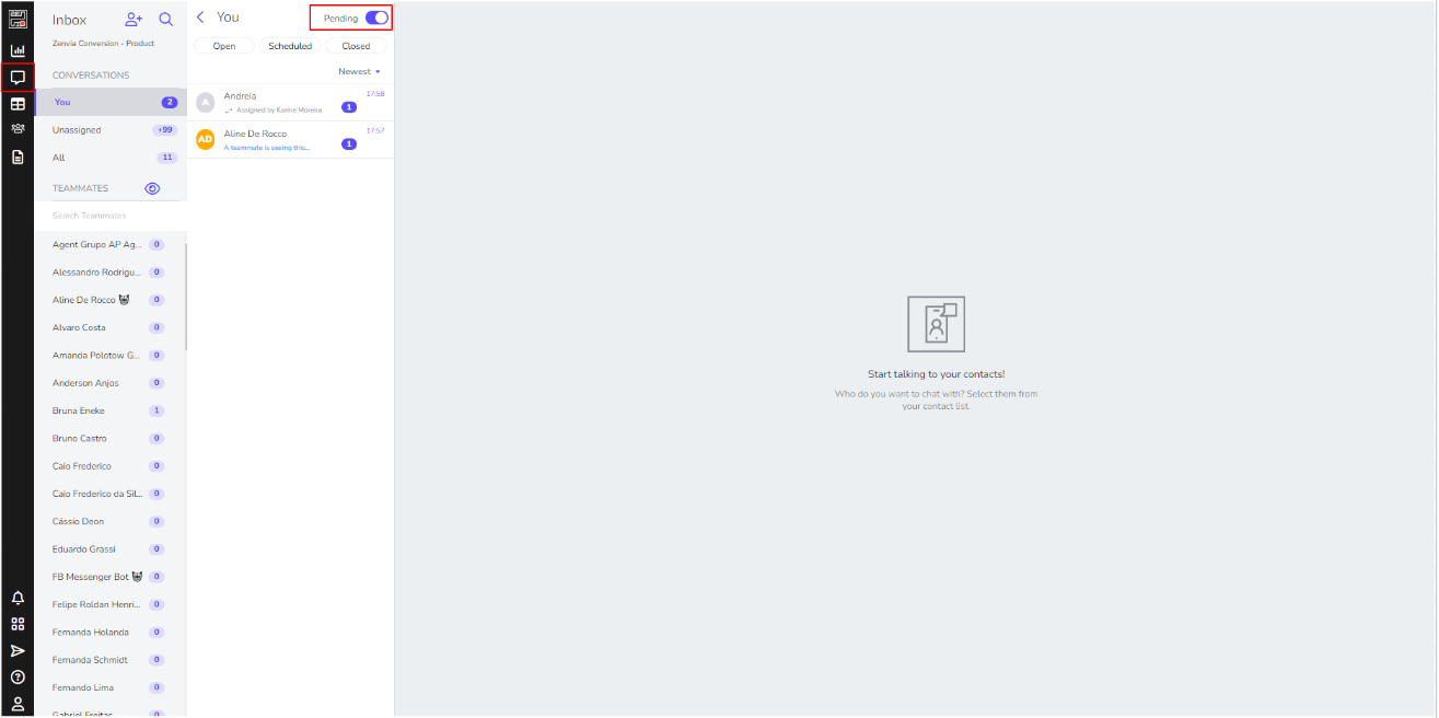 If you activate the Pending button, it will filter to display only messages from contacts awaiting interaction.