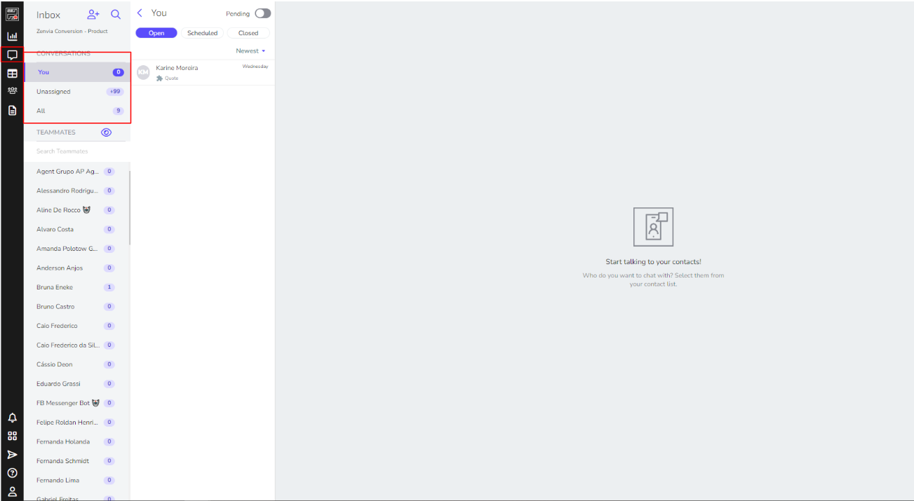 Located in the left sidebar menu, Chats is a module of Zenvia Conversion where interactions and message exchanges between your company and a contact occur.