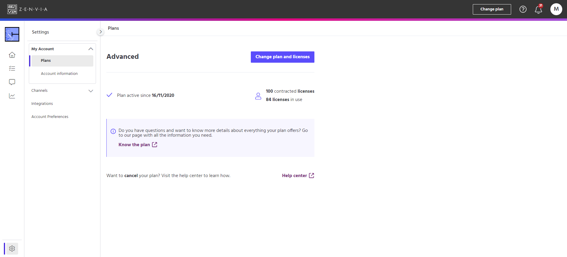 Zenvia Chat's Plans feature allows the account administrator to understand which plan their account is associated with, as well as to request the expansion of licenses and change their plan in a practical and clear way (check out the available plan options here).