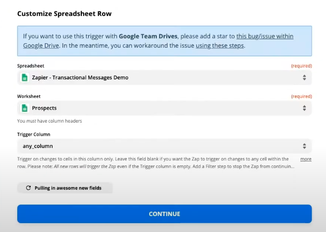Select the action that will trigger the workflow in Zapier. In this case, the trigger will be adding a new row to the spreadsheet.