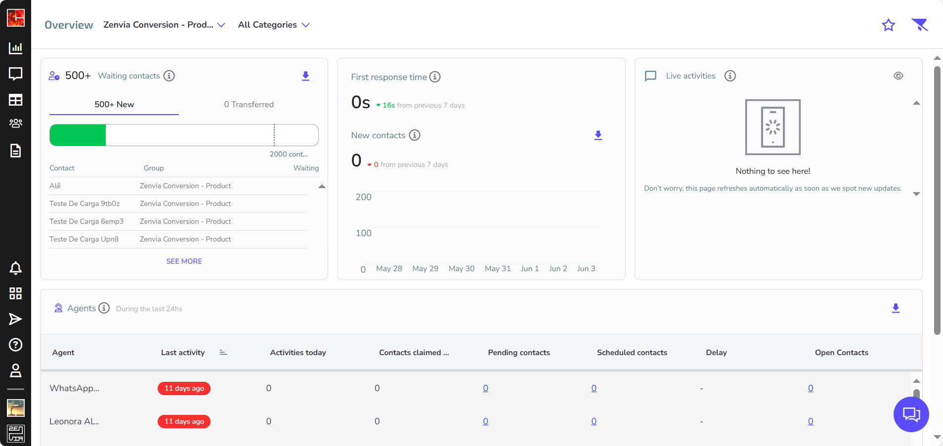 Located in the side menu, the Overview represents the home page of Zenvia Conversion. It provides a summary of open tickets, real-time activities, and performance metrics for your team.