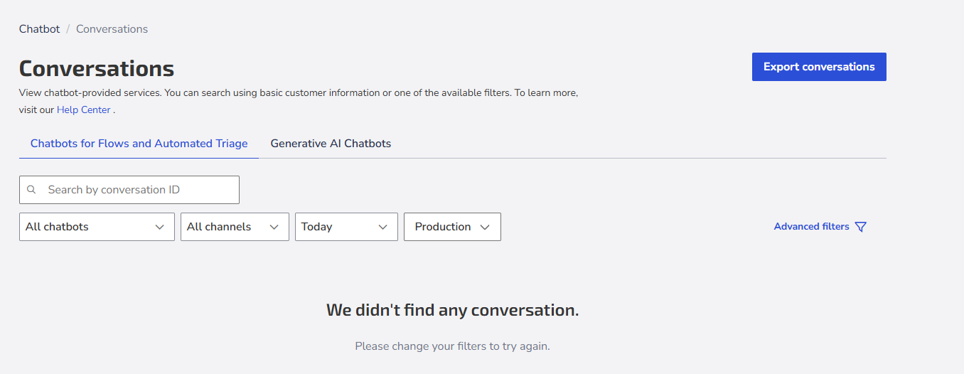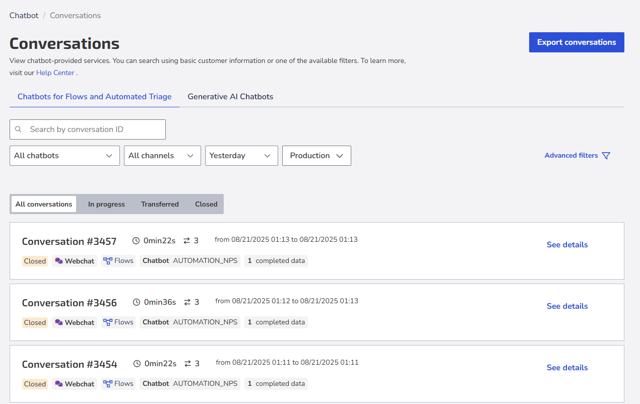 1. Flow chatbots and Automated triage: displays conversations conducted by the flow or triage chatbots you created.