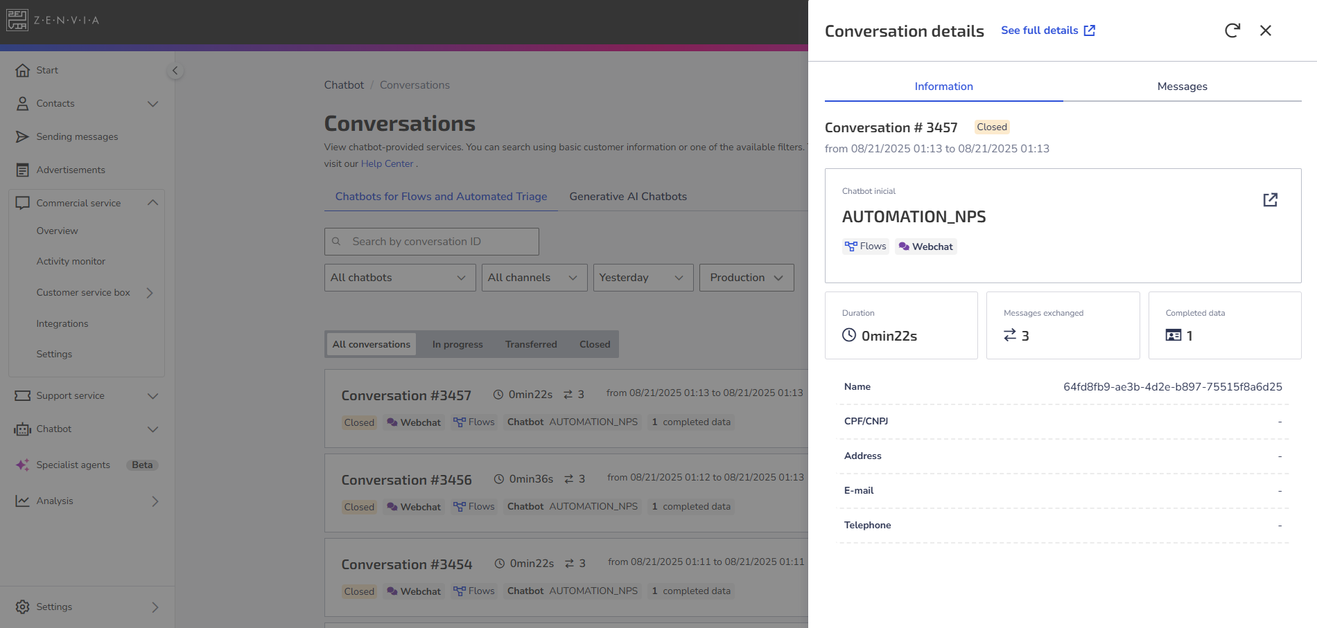 By clicking on View details on any card in the list of conversations, a side view opens with two tabs: Information and Messages.