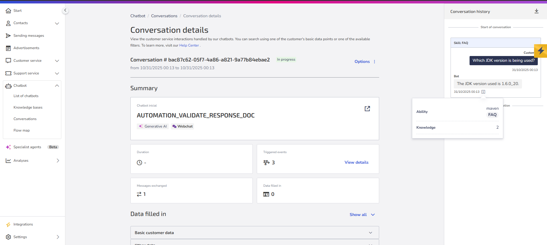 Under Summary you will find conversation information such as Duration, Events triggered, Messages exchanged, and Data filled in.