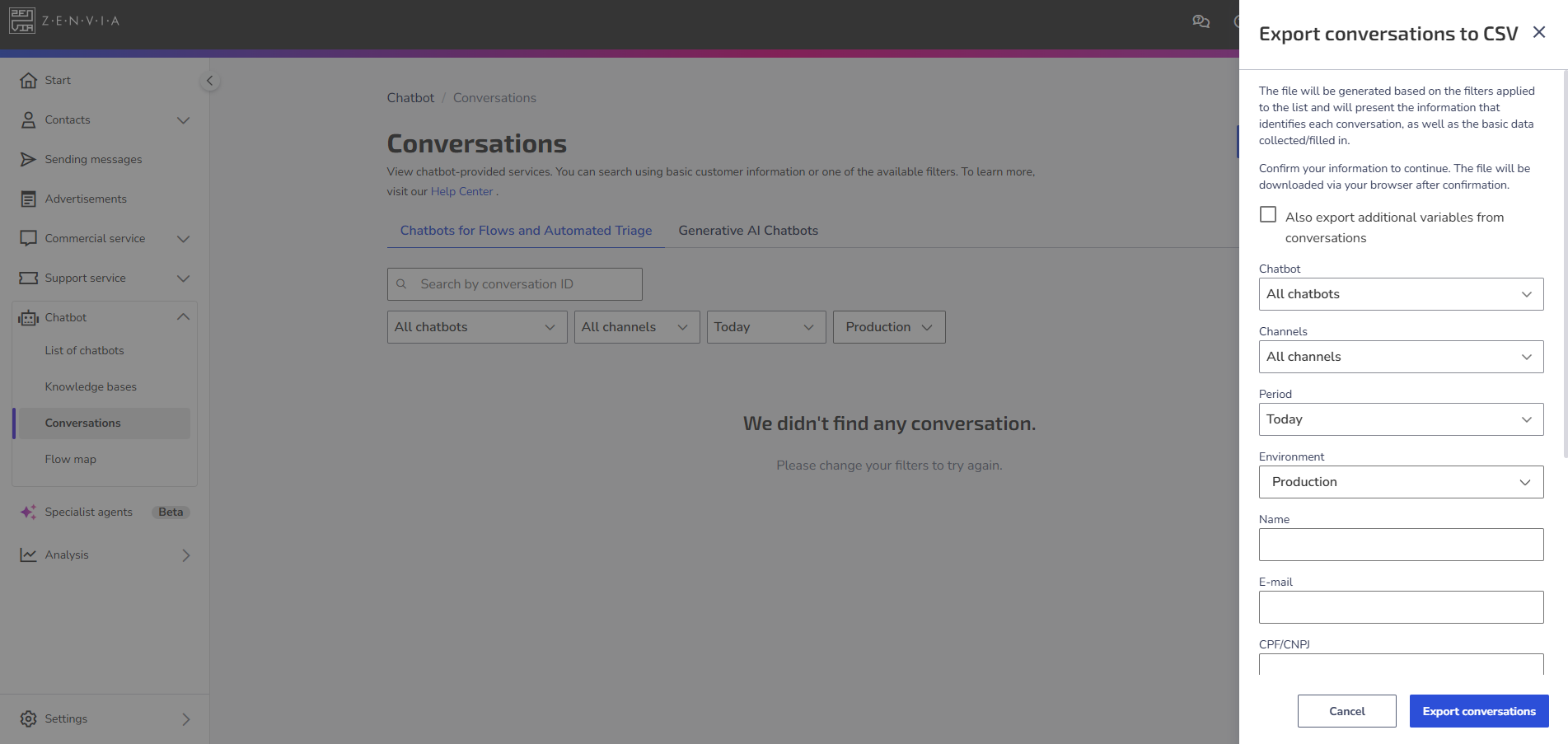 If you want to save the data for analysis outside the platform, click on Export conversations. This will generate a file with the interactions based on the filters applied.