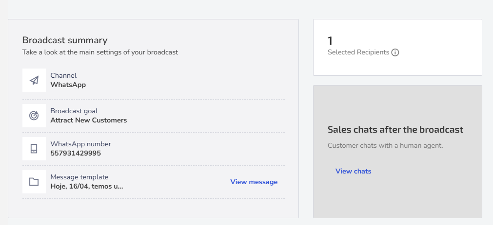 The send summary displays the configurations, including channel, purpose, and sent message, depending on the chosen channel. For example, in WhatsApp, it shows the number and template used; in RCS Basic and Rich Card, the main and fallback message; in Email, the subject line; and in SMS, the message content and possible message splits.
