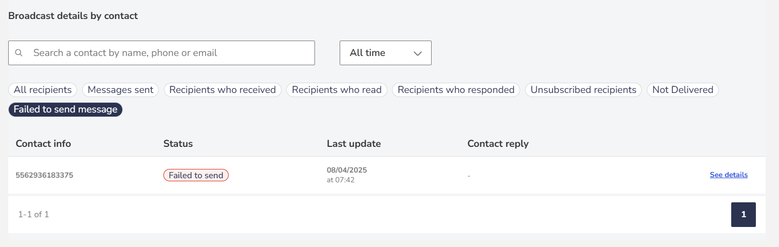 - Use the filters Failed to send message or Not delivered, available in the sending details list by contact, and click View details to identify the error reason.