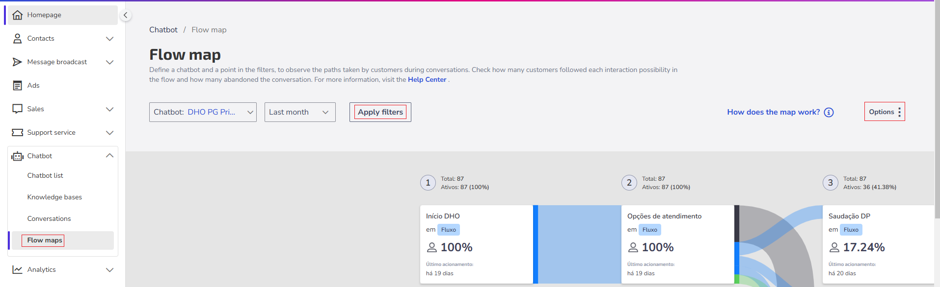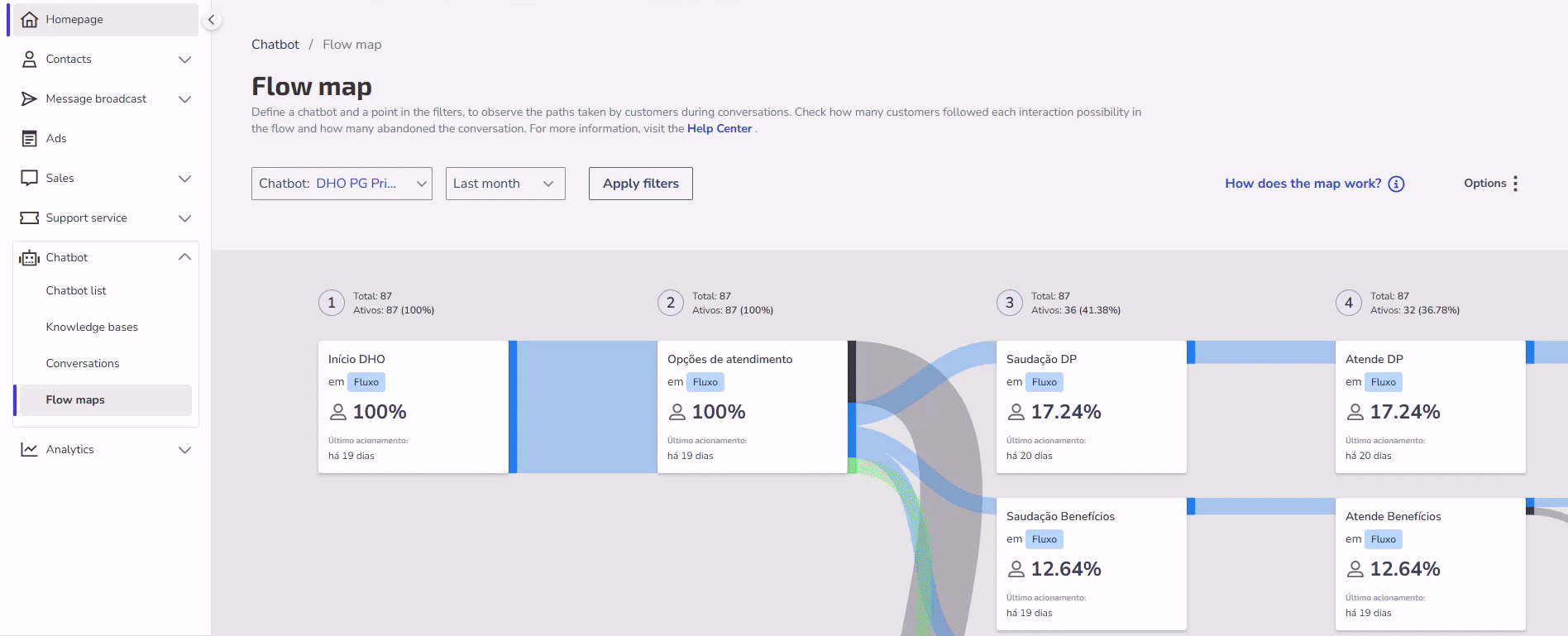 In Zenvia Customer Cloud, the Flow Maps functionality allows understanding and optimizing the customer journey when interacting with the chatbot. It provides valuable insights into how users progress through the conversation flow and highlights the points where drop-offs are most frequent.