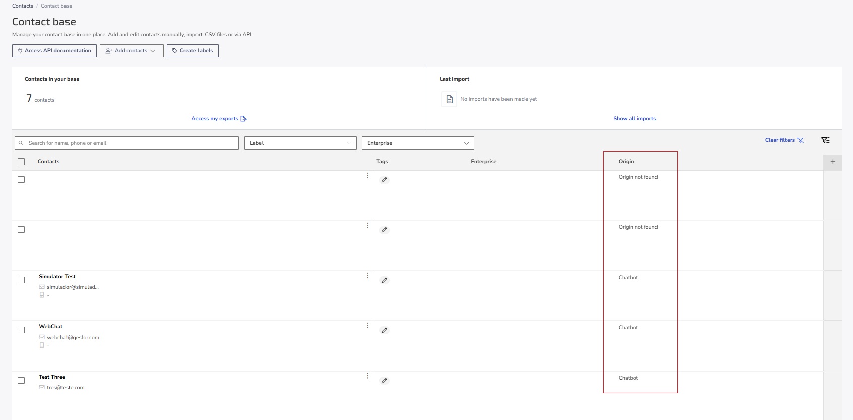 - Origin: This filter allows you to identify where each contact in your Contacts Base came from. The origin is filled in automatically based on the channel or flow used. For example, if the contact was created through a conversation with the Chatbot, the origin will be recorded as "Chatbot".