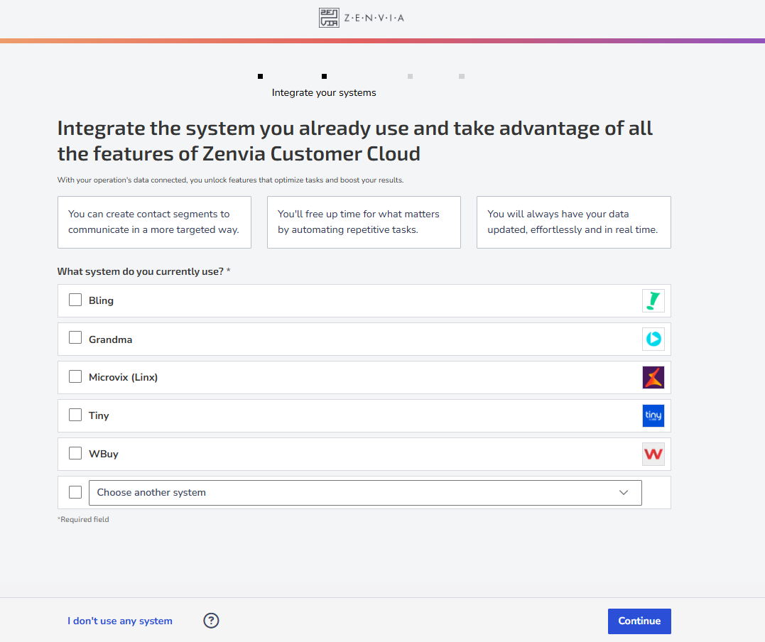 After Zoe's introduction, you'll be directed to the Integrate your systems screen. There, you'll see the question: "Which system do you want to integrate?" followed by a list of the most popular systems that can be integrated.