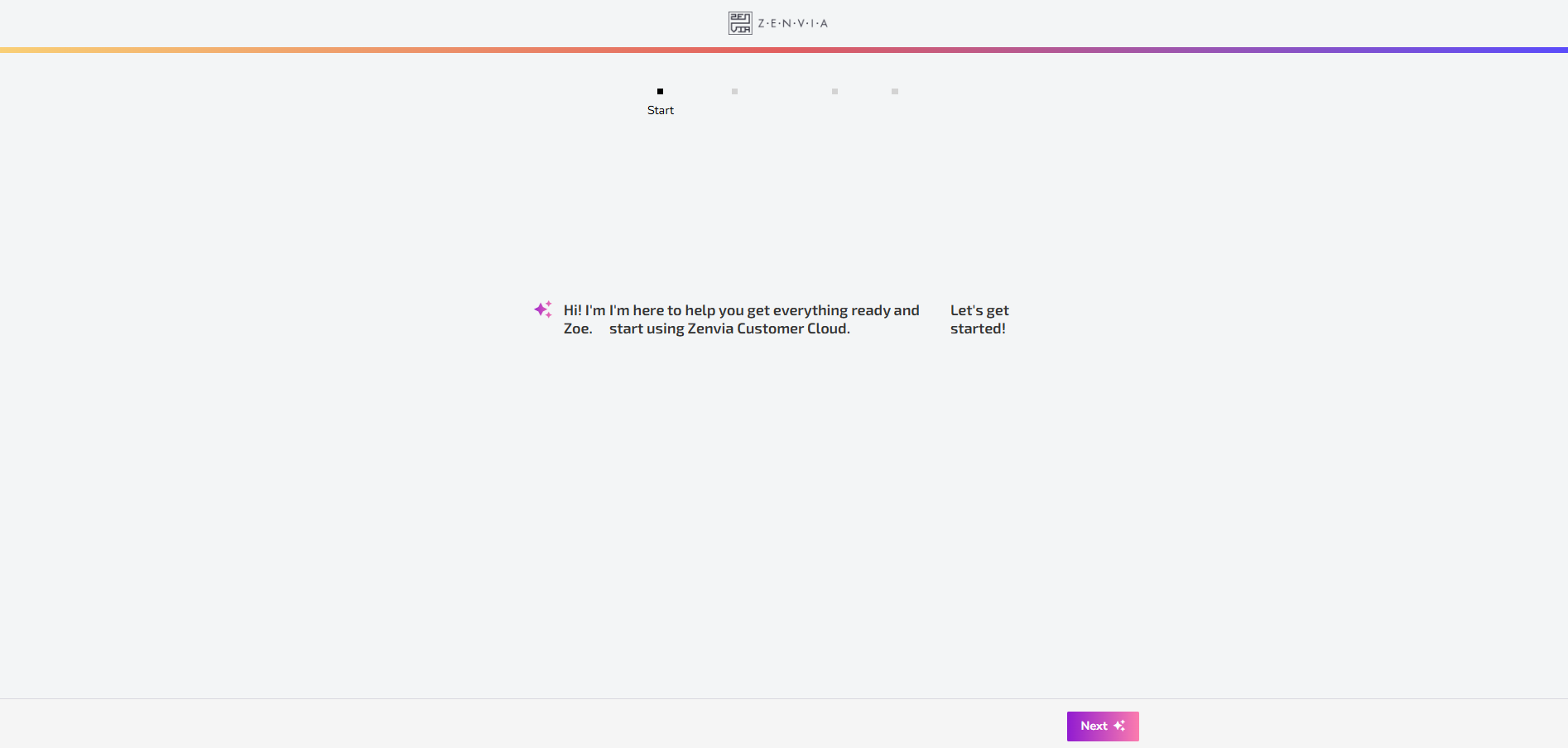 After logging into Zenvia Customer Cloud for the first time, you'll be greeted by Zoe, who will help you get everything ready to start using the platform. Click Next to proceed with the initial steps.