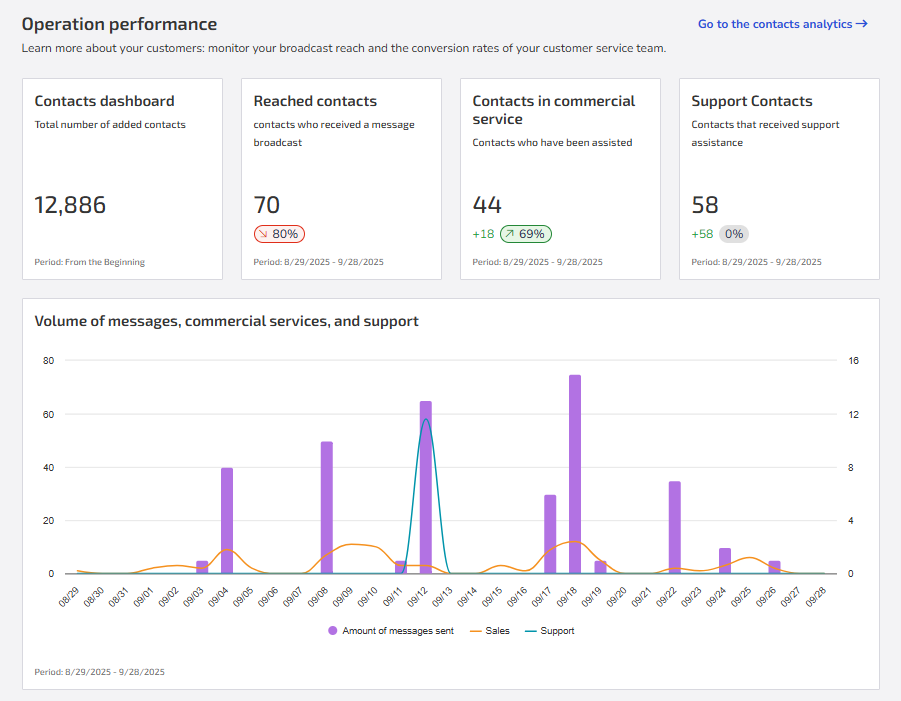 Contacts who received at least one message in the last 30 days. Includes a comparison with the previous period, indicating absolute and percentage changes. This helps understand the reach of communication campaigns.