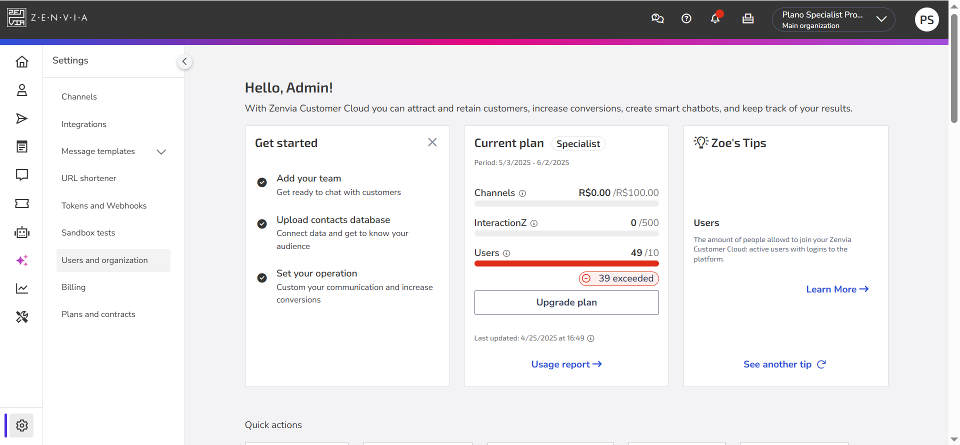 AdminThis profile has full access to Zenvia Customer Cloud, including all features, reports, and advanced organization settings.