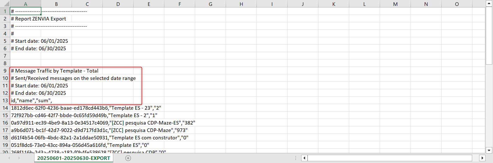 When clicking on Dispatch Report, a CSV file is generated with a summary of message traffic by template for a selected month.