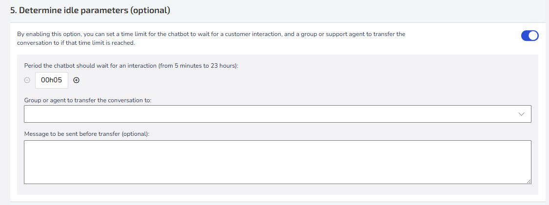 Step 5: Determine the inactivity parameters, if desired. Simply enable the option with the button, choose the inactivity time between 5 minutes and 23 hours, a group or agent to receive the conversation transfer, and an optional message that will be sent to the end customer when transferred.