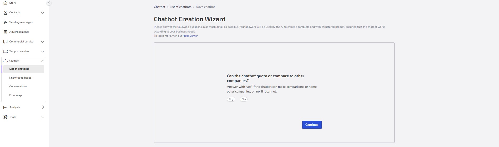 Important: If you do not want the chatbot to make comparisons with other companies in your industry, check the option Do not make comparisons with other companies, located above the Create chatbot button. By selecting this option, the chatbot will only use the information provided in the guidance field.