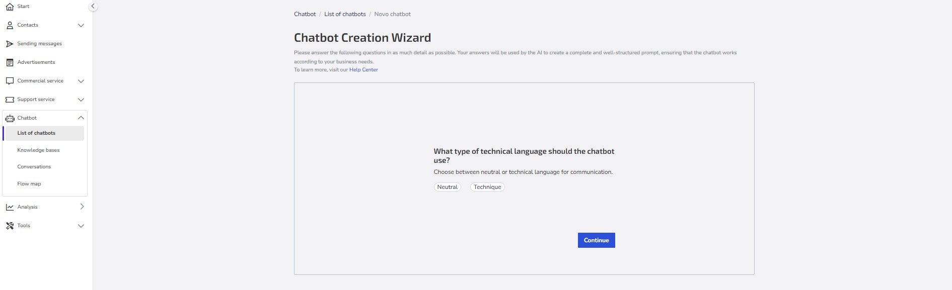 3- Choose the type of language the chatbot should use, which can be either neutral or technical for communication.
