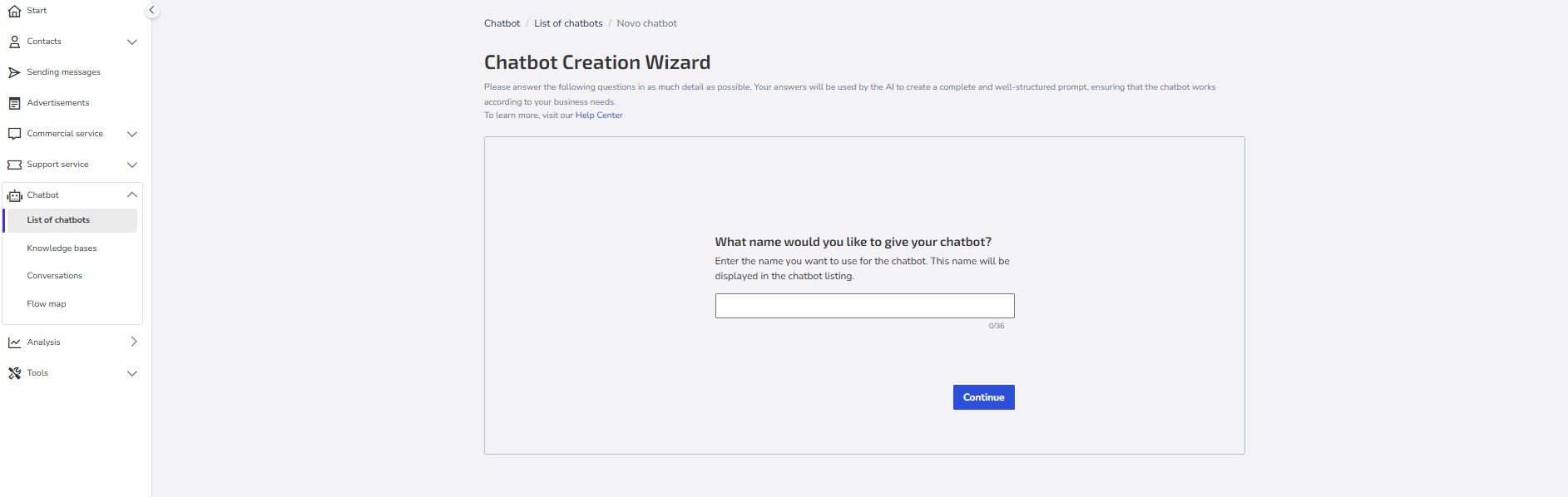 Give the chatbot a name: Choose a clear and objective name that easily identifies the purpose of your chatbot (e.g., "Online Store Support," "Sales Assistant").