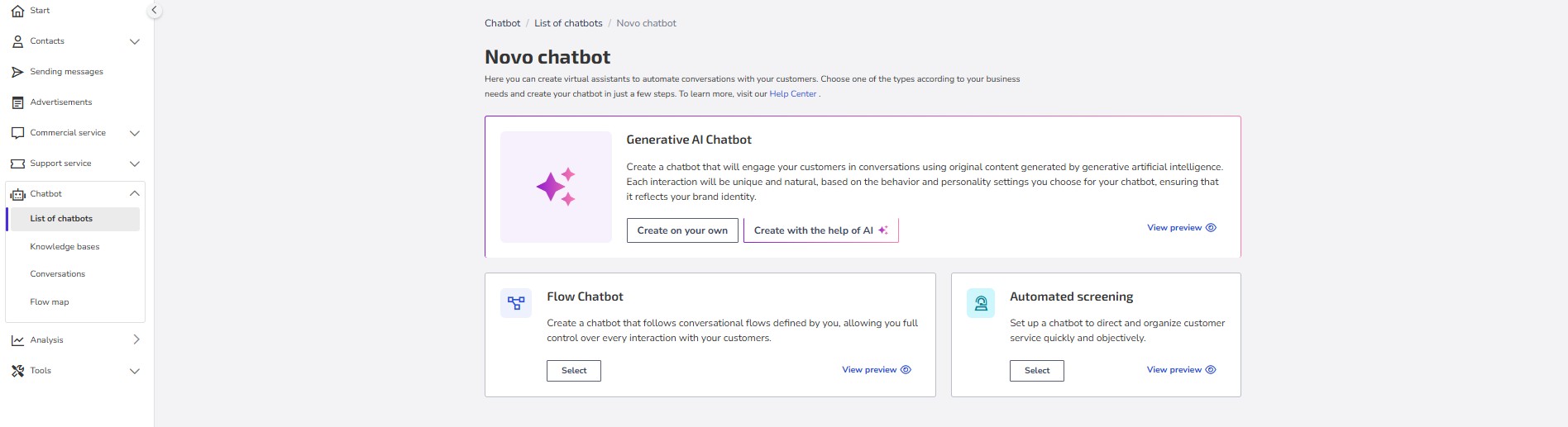 In Zenvia Customer Cloud, you have two options to create your AI chatbot: