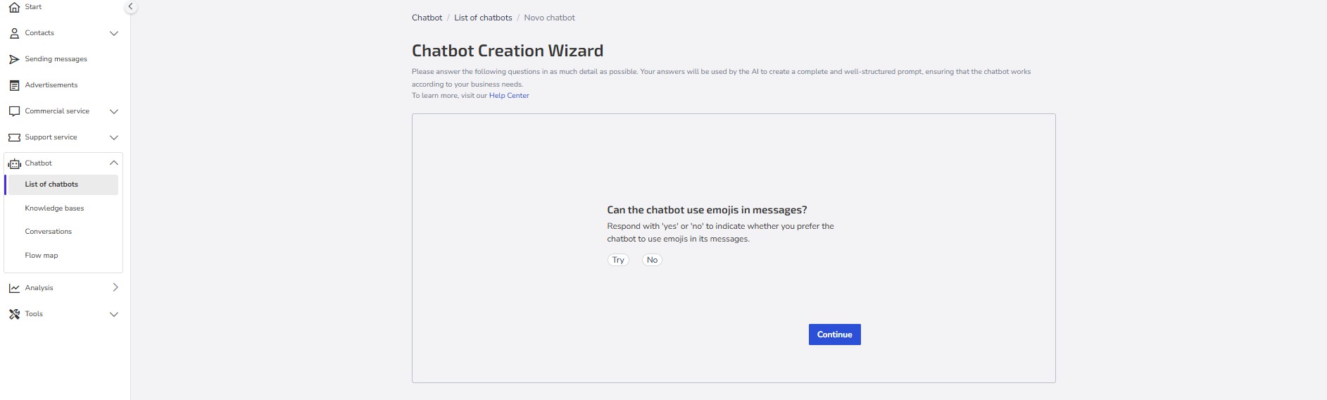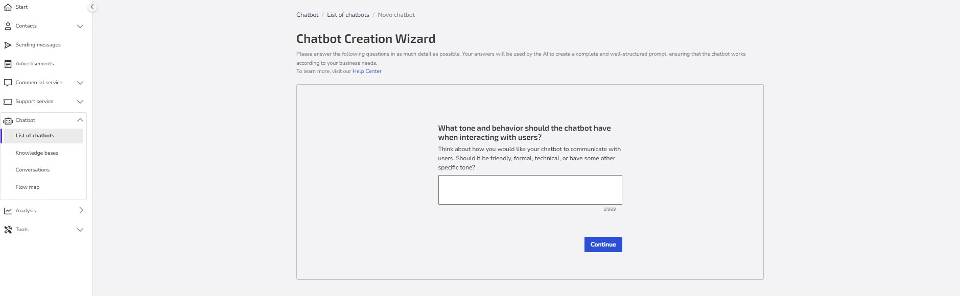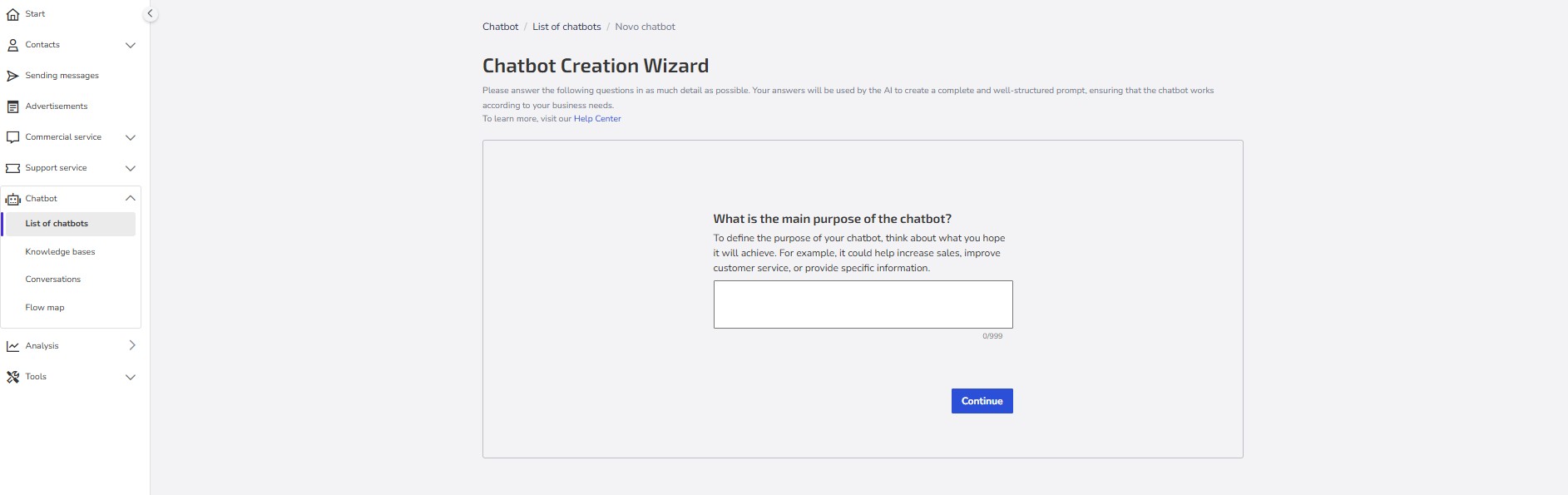 Give the chatbot a name: Choose a clear and objective name that easily identifies the purpose of your chatbot (e.g., "Online Store Support," "Sales Assistant").