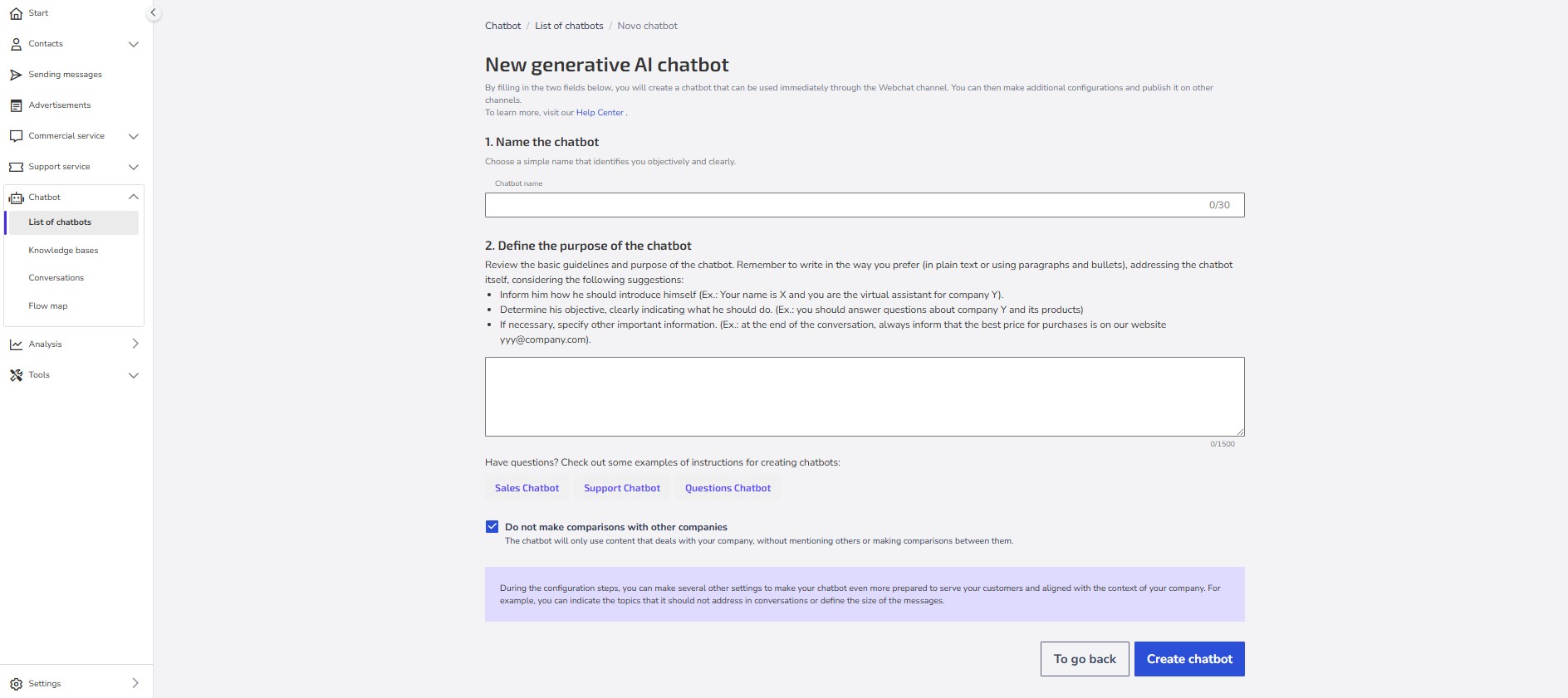 Important: If you do not want the chatbot to make comparisons with other companies in your industry, check the option Do not make comparisons with other companies, located above the Create chatbot button. By selecting this option, the chatbot will only use the information provided in the guidance field.