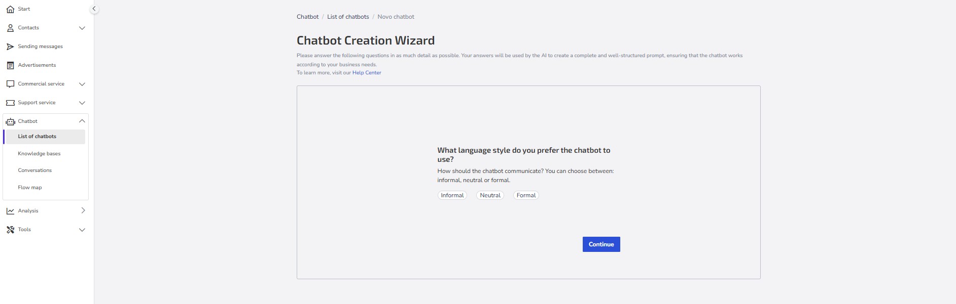 2- Define the language style you prefer the chatbot to use. Here you choose how the chatbot should communicate, and you can choose between: informal, neutral, or formal.