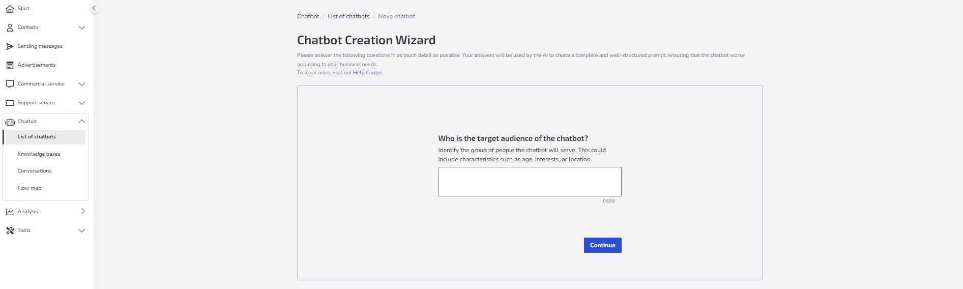 Give the chatbot a name: Choose a clear and objective name that easily identifies the purpose of your chatbot (e.g., "Online Store Support," "Sales Assistant").