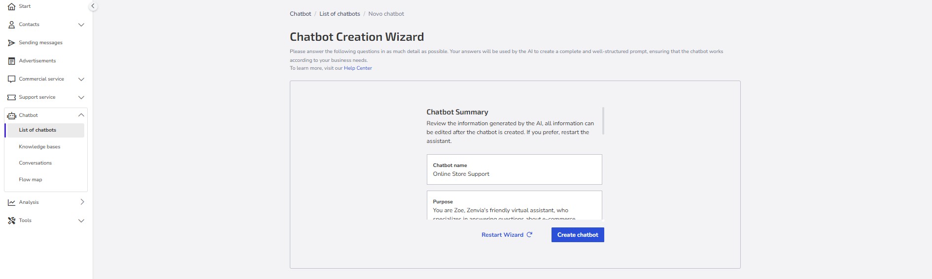 13- Finally, review the information generated by the AI. All information can be edited after the chatbot is created. If you prefer, restart the assistant. If everything is correct, finalize by clicking Create chatbot.