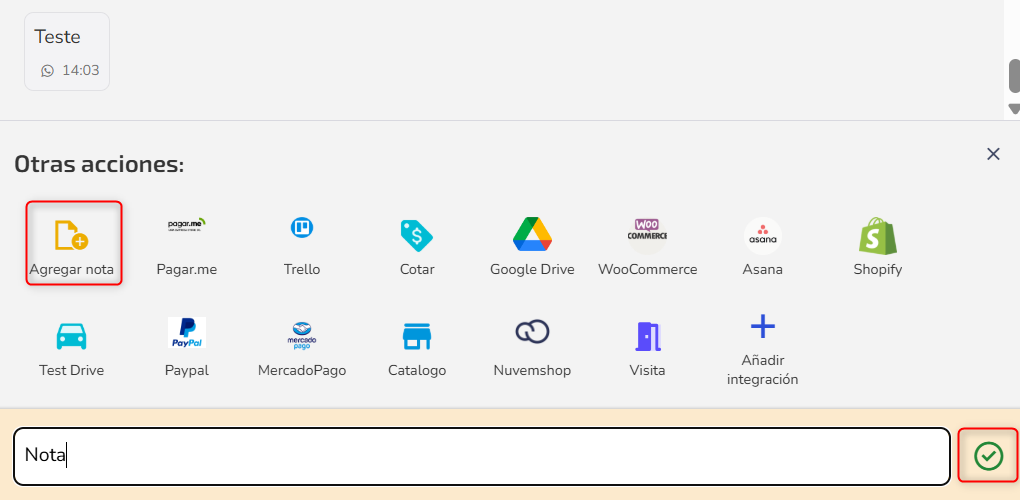 For the applications to appear and function in the inbox actions, they must be previously integrated in the menu Sales > Integrations.