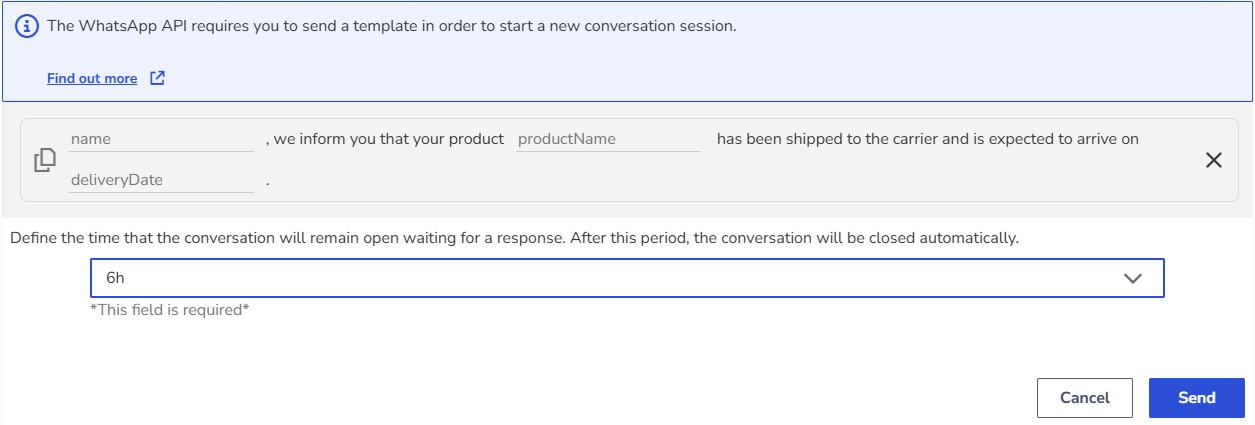 💡 Tip: If the contact has an open session or is in a chatbot, it will not be possible to send message templates until the current session is finished or expired.