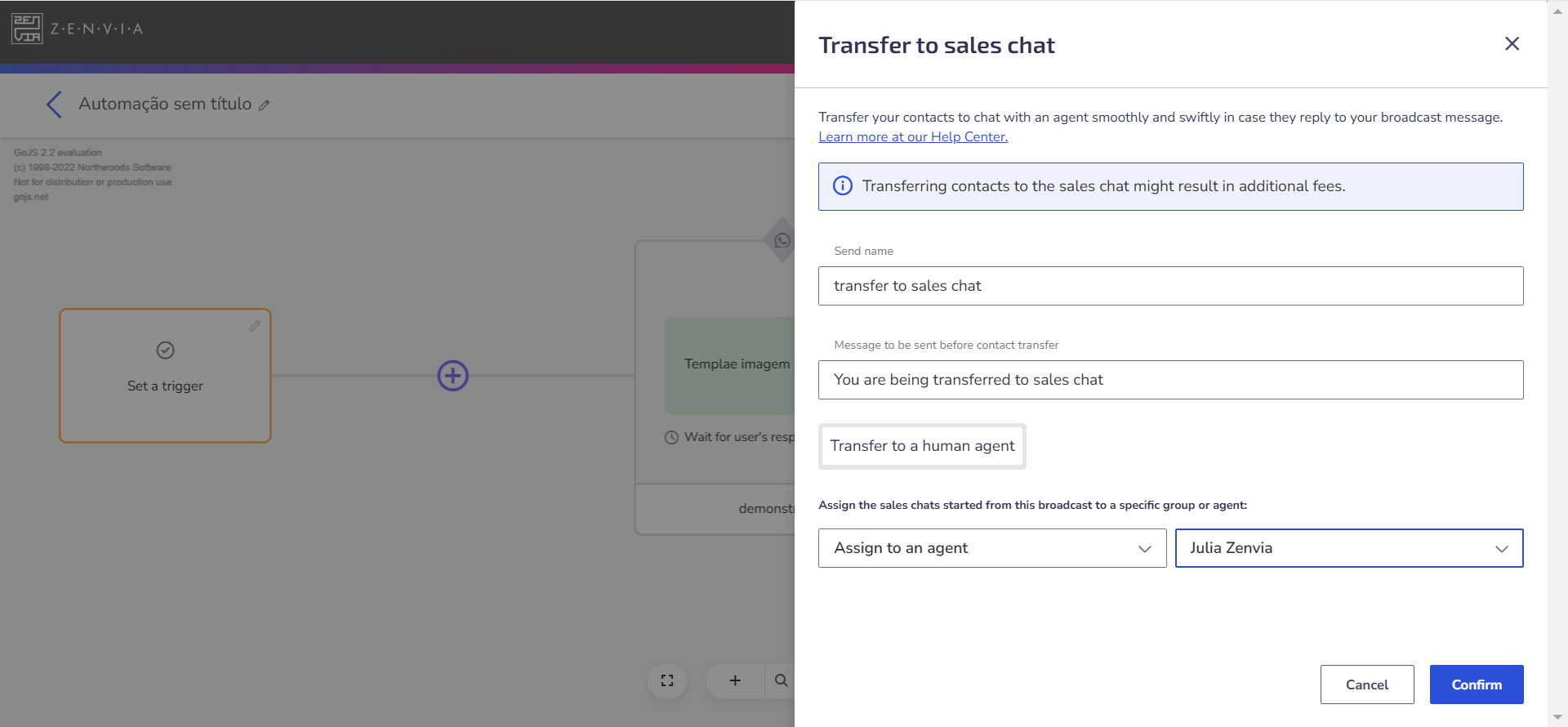 - Add a new step by clicking + and select Transfer to sales chat.