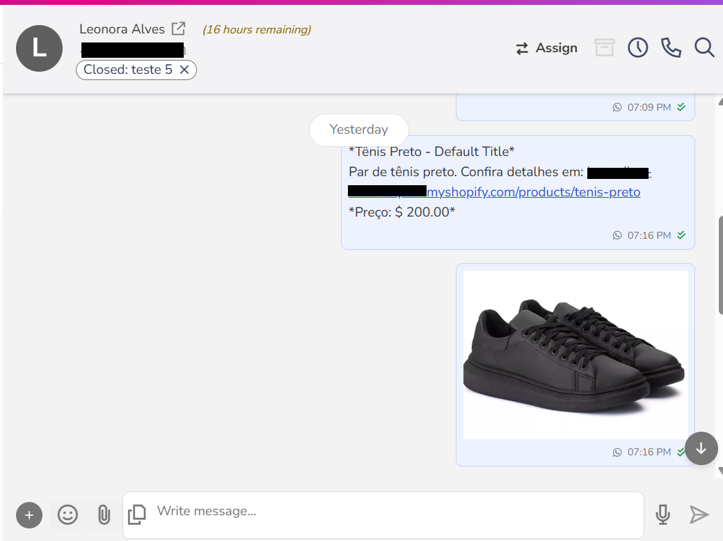 2. Sending product details: Quickly share the name, details, price, and link of a product from your store directly in the service conversation, using the SKU code.