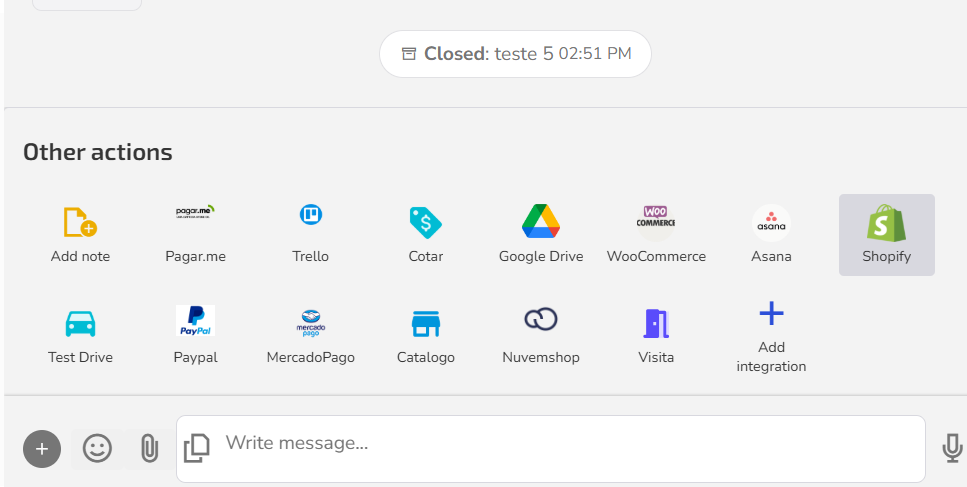2. Click the other actions button (located to the left of the typing area) and select the Shopify icon. A new screen will open.