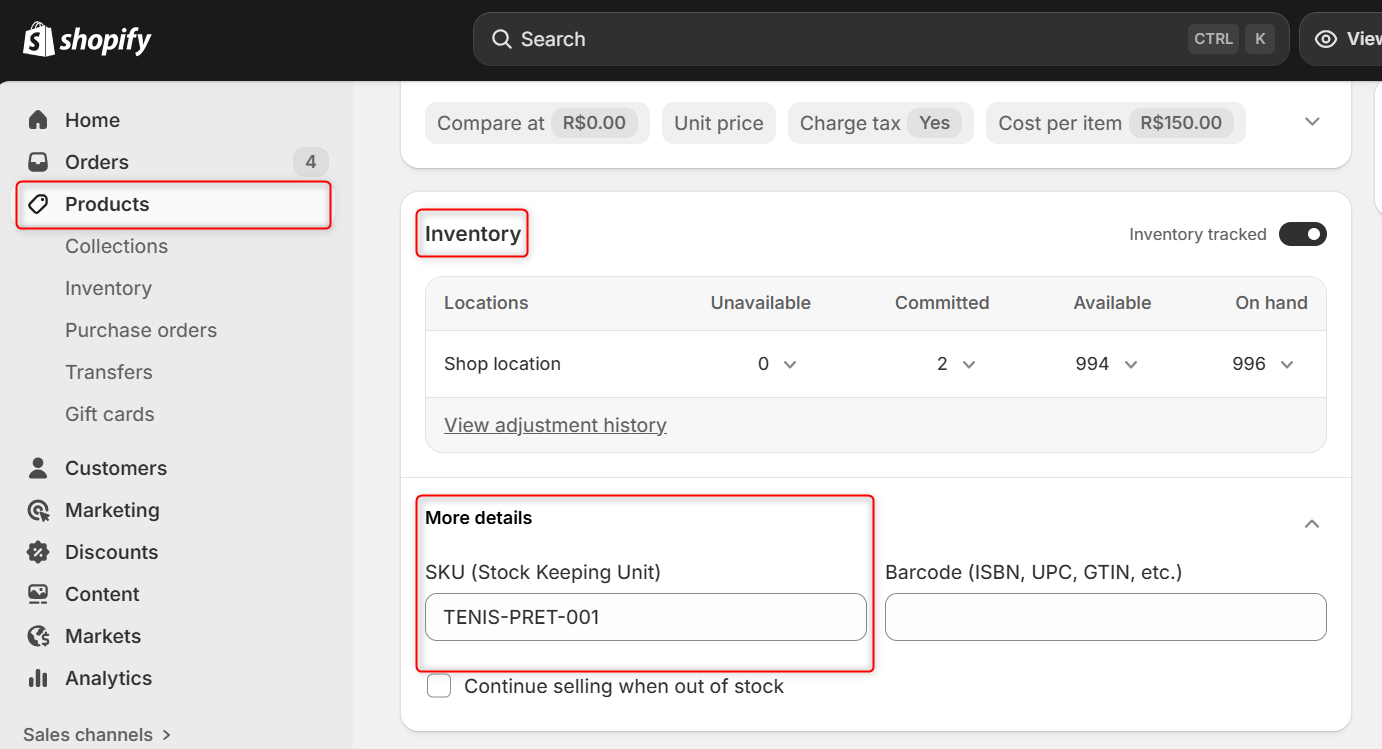 💡 The SKU (Stock Keeping Unit) is the product's stock reference. You can find it on Shopify in Products > access the product > Inventory section.