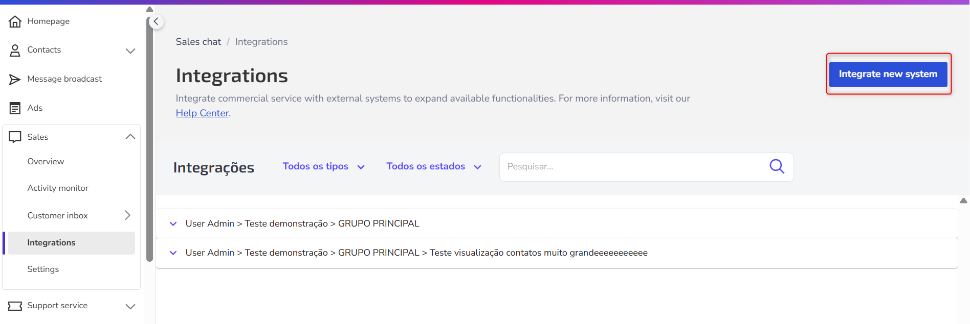 1. In the side menu of Zenvia Customer Cloud, go to Sales > Integrations.