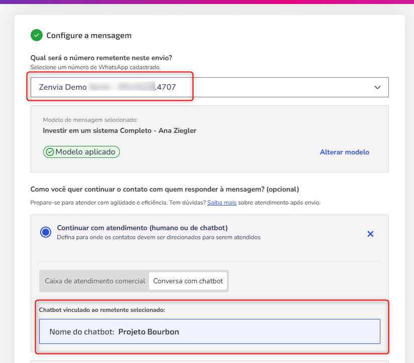 Chatbot linked to WhatsApp: Have a chatbot linked to the same WhatsApp number that will perform the message sending. If the number is already linked to a chatbot, it will be automatically displayed during configuration.