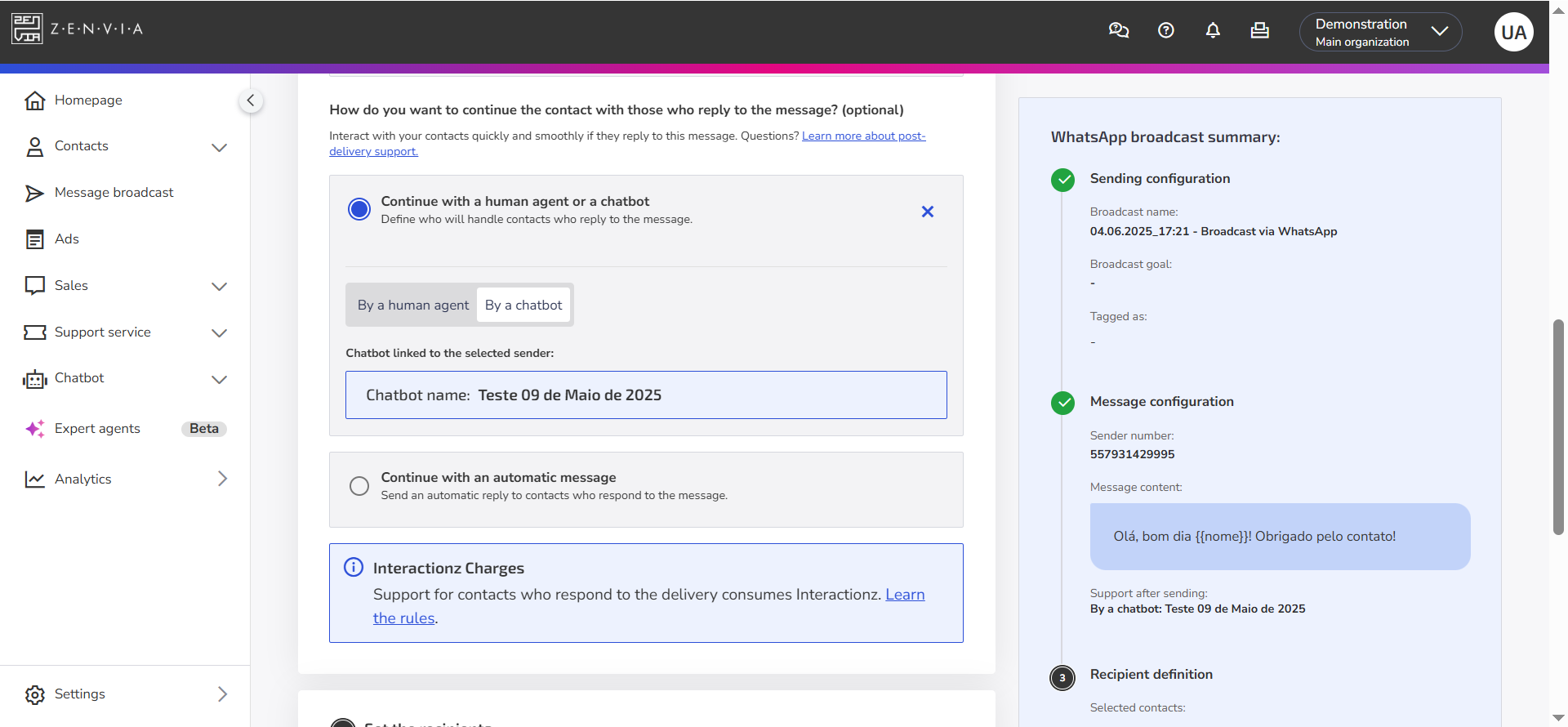 After sending, all contacts who respond will be automatically directed to the chatbot configured for this WhatsApp number. This chatbot will continue the conversation and may transfer the service to a Commercial Service agent, as needed.