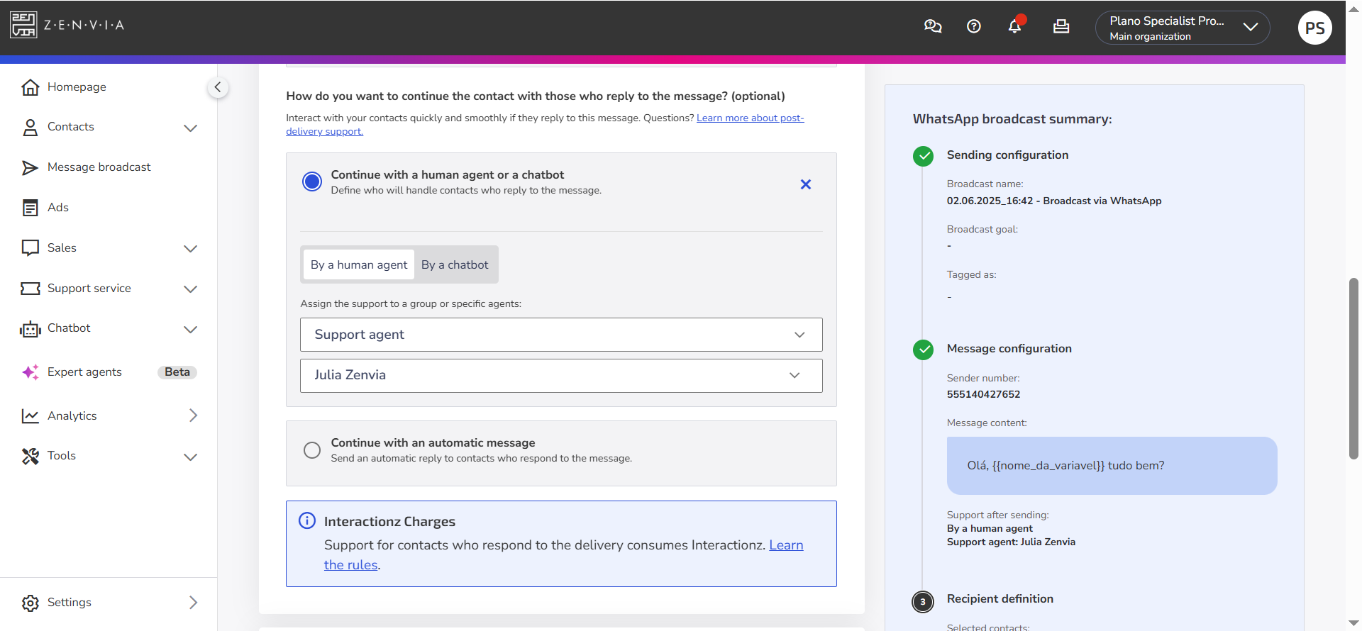 Learn how to configure WhatsApp sending in Zenvia Customer Cloud so that contacts who reply are automatically directed to human support.