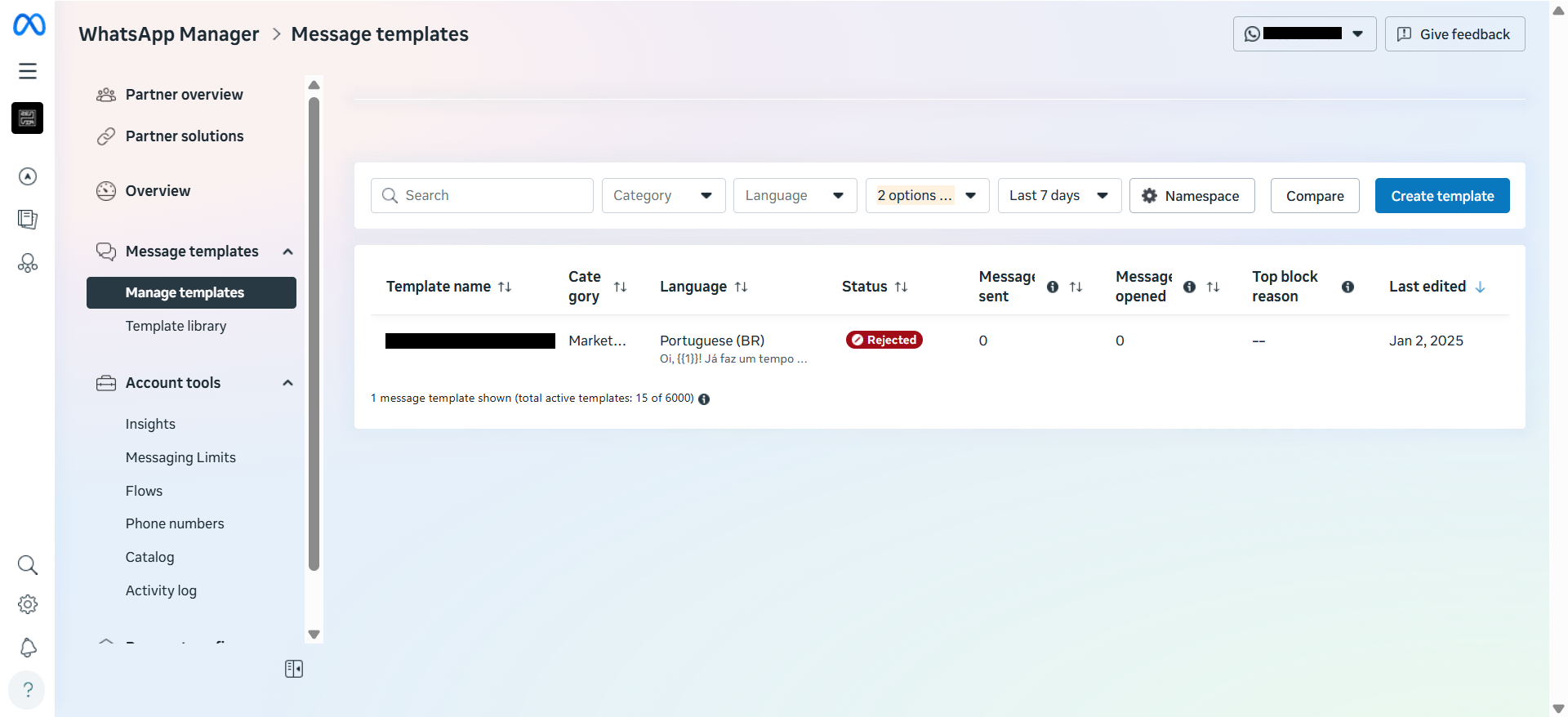 When accessing Settings > Message templates > WhatsApp, if you see the status Rejected next to the template name, it means Meta has rejected the content.