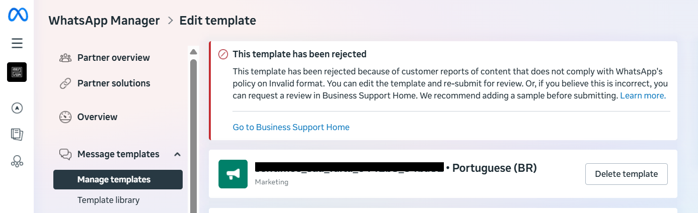 When accessing Settings > Message templates > WhatsApp, if you see the status Rejected next to the template name, it means Meta has rejected the content.
